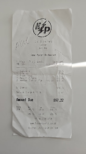 Thankfully, our experience turned around when Alice came to serve us. She was fantastic—very friendly and thorough in explaining the menu. Alice was cheerful and made great recommendations, including her favorites: prawn tacos and fish tacos. We ordered what she suggested, and the food was delicious. Throughout the meal, Alice made sure we were having a good time and really took care of us. Having worked in customer service for over 20 years, I rarely see someone as dedicated as Alice. She truly made our night. I even asked her how long she's been working there (6 months)and she said she loves her job and making customers happy is her main goal. A big WELL DONE to Alice! I would give this lady a pay rise!