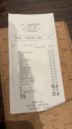 Read moreEasily the best restaurant in North London, El Vaquero is a modern Brazilian Churrasqueria that caters for carnivores, pescetarians and vegetarians alike. The main attraction is the meat, which is carved beautifully on to your plate. However the pescetarians and vegetarians will also be delighted with the best salad buffet and hot buffet in the whole of the UK. The deli style salad bar has a wide range of choices and the hot buffet includes great accompaniments to the main event. Pre order fish otherwise if you are carnivores, come hungry.