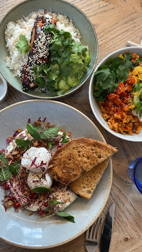 I had the Turkish eggs with yogurt, pomegranate seeds and I think it was basil. Nice combination. Great bread, but you have to ask for butter.