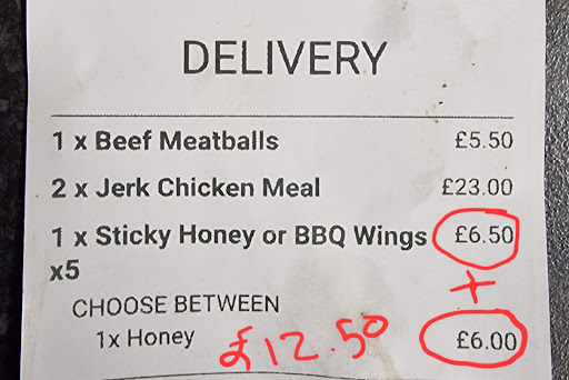 Typically, I enjoy a portion of three honey wings for a reasonable price of £6.50 when dining in. However, when I placed my delivery order, they quoted a staggering £12.50 for just three wings. I immediately suspected an error, but to my surprise, Escape Bar claimed it would be two portions for this inflated price. Relieved, I agreed to the deal.