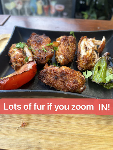 Chickens wings for £8 (put other stuff on invoice as £8.95 and ask me to pay instead), tasty frankly Okay, but you can tell very unfresh meat, dry , WITH FUR ON WINGS!