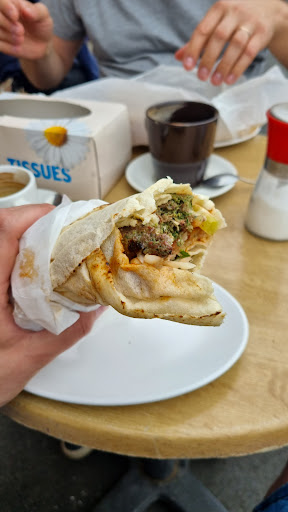 Very nice friendly cafe. Outside you see a list of some the items inside but it is a partial list. İnside there is a menu on the wall with various items including: Chicken kebab £4.50. Lamb shish £7.50 Falafel wrap £4.00 Chicken escalope £4.50 Veg pizza £5.50. Salami pizza £6.00 Cheese pizza £2.50. Spinach pizza £3.00 Chips £2.90 Chicken Curry £5.00 Lamb curry £6.00 Moussaka £4.00 Coffee £2.00. Tea £1.50 Juice bottle £1.00 Soft drink bottle £1.00