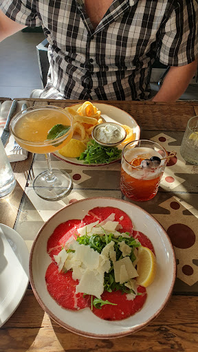 As a starter we had Calamari and Carpaccio. Calamari was a bit disapointment because were touhg (rubbery, especially small pieces), tastewise and presentation was good but next time I rather choose differernt starter, however Carpaccio was delicous, no stringy stuff stucked between your teeth. Light and tender, melt in your mouth beef. I recommend a little drizzle with their house garlic oil. For main we had pizza Burrata and Seabass. Pizza was very nice, thin and crispy dough, fresh ingredients, huge creamy Burrata in the middle just spot on! Seabass was a star for me. Presentation was pretty decent, nice three fillets of juicy seabass with delicate crispy skin and the garnish with it was just completing the dish so well. Honestly the best seabass in London I had so far. For dessert we chose banoffee pie, that was outstanding sweet dot. Very well balanced not too sweet or heavy on cream, also presentation was eye catching. As a cocktails we had Sour and Old Cuban both were flavourfull and very well presented. Overall good atmosphere friendly and caring stuff, minimum waiting time everything was just right, except the Calamari. Anyway already thinking about what we gonna have next time when we visit, I believe it will be soon.