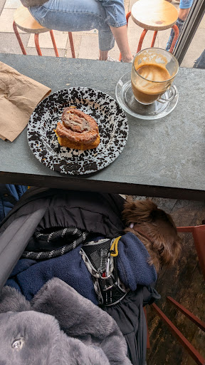 I got there around 11:30am and there was a queue with lots of people both sitting inside and outside although luckily I didn't have to queue long as lots of customers were only getting things to do. There were so many sweet options ranging from cake loaves to sandwiches and everything looked absolutely scrumptious. I decided to go with the pumpkin brown butter brioche bun and an oat flat white and I sat down inside since I was getting tired from carrying the dog in a puppy carrier bag.
