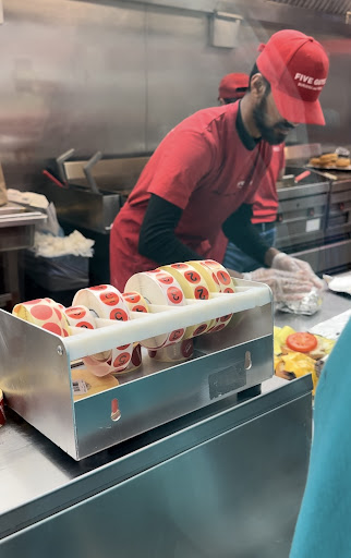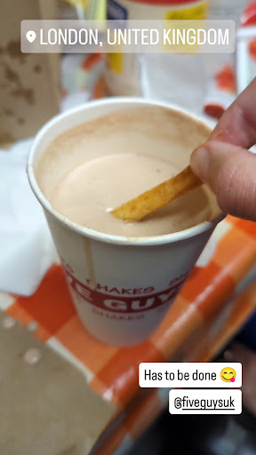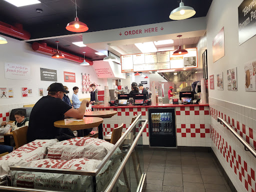 Read moreI have been to a few different five guys both UK and US, and have never been disappointed. The food seems a little expensive so not a cheap fix like BK or McDonalds, but it’s 100% worth it for the food you get. One portion of fries is massive and can happily serve 2-3 people as a side and the burgers are amazing. Fries are heavily salted but that’s how I like them personally, not sure if you can get unsalted but it’s worth asking. They have a sign up telling you where their potatoes for the day are from, great if your worried about sustainability as they’re usually local farmers. The soda machine has every flavour imaginable, as well as caffeine free and diet options. The open kitchen lets you see your food as it’s cooked which is nice if your a “neat freak”. There’s plenty of seating and free peanuts if you like. If you have a severe peanut allergy I wouldn’t recommend but besides that it’s somewhere you should go...