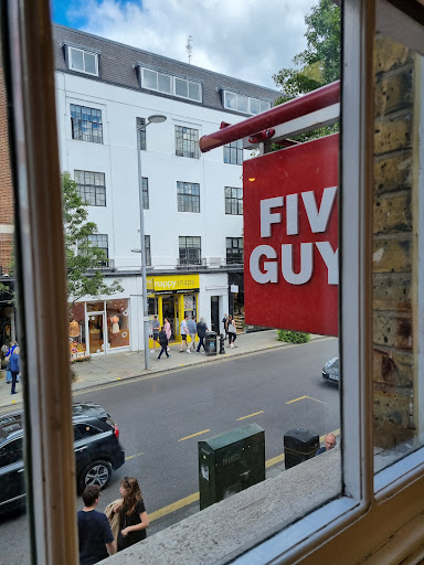 A relatively small branch of the rapidly expanding Five Guys operation. Which is just as well as this is a clinical yet extremely noisy environment, and not that efficient. On my previous visit they "mislaid" my order, and served a large number of later motorbike orders whilst I stood there for nearly 25 minutes. They offered to refund me, by which time the tills were swamped. However speedy the service may be for you, the burger "patties" will probably be slightly burnt, as they are extremely thin. The bacon topping will certainly be burnt to a crisp. I think that MacDonalds is a more reliable experience, considering that a Quarter Pounder with cheese is about a third of the price. If you are thinking that all of this is not very "King's Road," then you are absolutely right, as far as I...