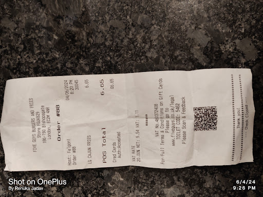 Read moreI was in London for a few days and thought I'd try Five Guys. Never again. I would normally only make the effort to leave positive reviews however this meal was awful. I'd seen the good reviews and then inside there are signs telling you it'll be the best burger you'll ever have. To me a burger is a burger so didn't have too many overexpectations. Mostly wanted to try somewhere different for a change. I did go at 5pm so it was getting busy. The staff were not friendly and expected you to know the menu off by heart asking about loads of extras after giving what I thought was a straightforward order. I got my food within a couple of minutes but in that way it must have been sitting ready for ages rather than cooked fresh. The burger was dry and overcooked. The fries are served spilt out in the bag and were also overdone. The drinks machine was playing up for the customer ahead of me then same for me. It came to just under £18 (regular burger, fries and coke). Yeah it's central London but really not worth it. Would I have thought so much about it if it was more reasonably priced, probably not. Not really...