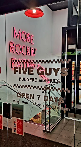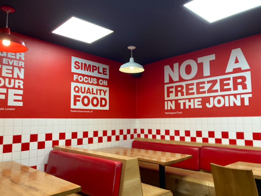Read moreFirst time visit to five guys anywhere! I didnât really know what to expect as never stepped foot in one until today, At first it felt like a more expensive Burger King with the layout and ordering system, the place was mostly clean toilets etc apart from a few tables that hadnât been wiped down yet? Coke from machine I think had been mixed with water? As most places do ? Surprisingly the burger was nice we had double burgers with fries (remind me of KFCâs) and extra toppings what were fresh, burger was done nicely and got the smaller ones for kids what they actually managed to finish so perfect size, the only downside was the cost! Just over ÂŁ55 for four of us that was 5 burgers, two V large fries and a large drink to share. To be honest in two minds about returning you canât complain about quality of the food as was nice but seemed very steep...