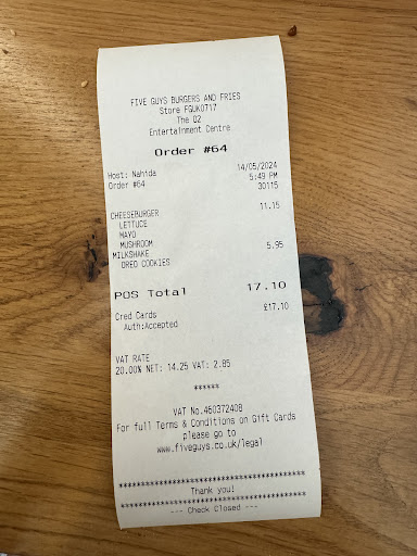 From the moment I stepped foot into the O2 Five Guys, I was welcomed by an atmosphere buzzing with energy, a testament to the passion and dedication that goes into every part of their food making process. The decor is understated yet chic, creating a vibe that is both casual and stylish, and the staff is engaging and warm, making you feel at home right away.
