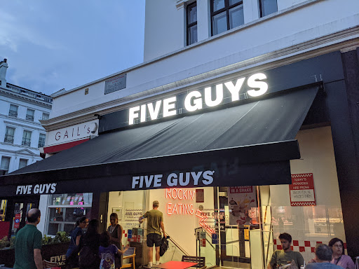 Read moreFirst time visit to five guys anywhere! I didnât really know what to expect as never stepped foot in one until today, At first it felt like a more expensive Burger King with the layout and ordering system, the place was mostly clean toilets etc apart from a few tables that hadnât been wiped down yet? Coke from machine I think had been mixed with water? As most places do ? Surprisingly the burger was nice we had double burgers with fries (remind me of KFCâs) and extra toppings what were fresh, burger was done nicely and got the smaller ones for kids what they actually managed to finish so perfect size, the only downside was the cost! Just over ÂŁ55 for four of us that was 5 burgers, two V large fries and a large drink to share. To be honest in two minds about returning you canât complain about quality of the food as was nice but seemed very steep...