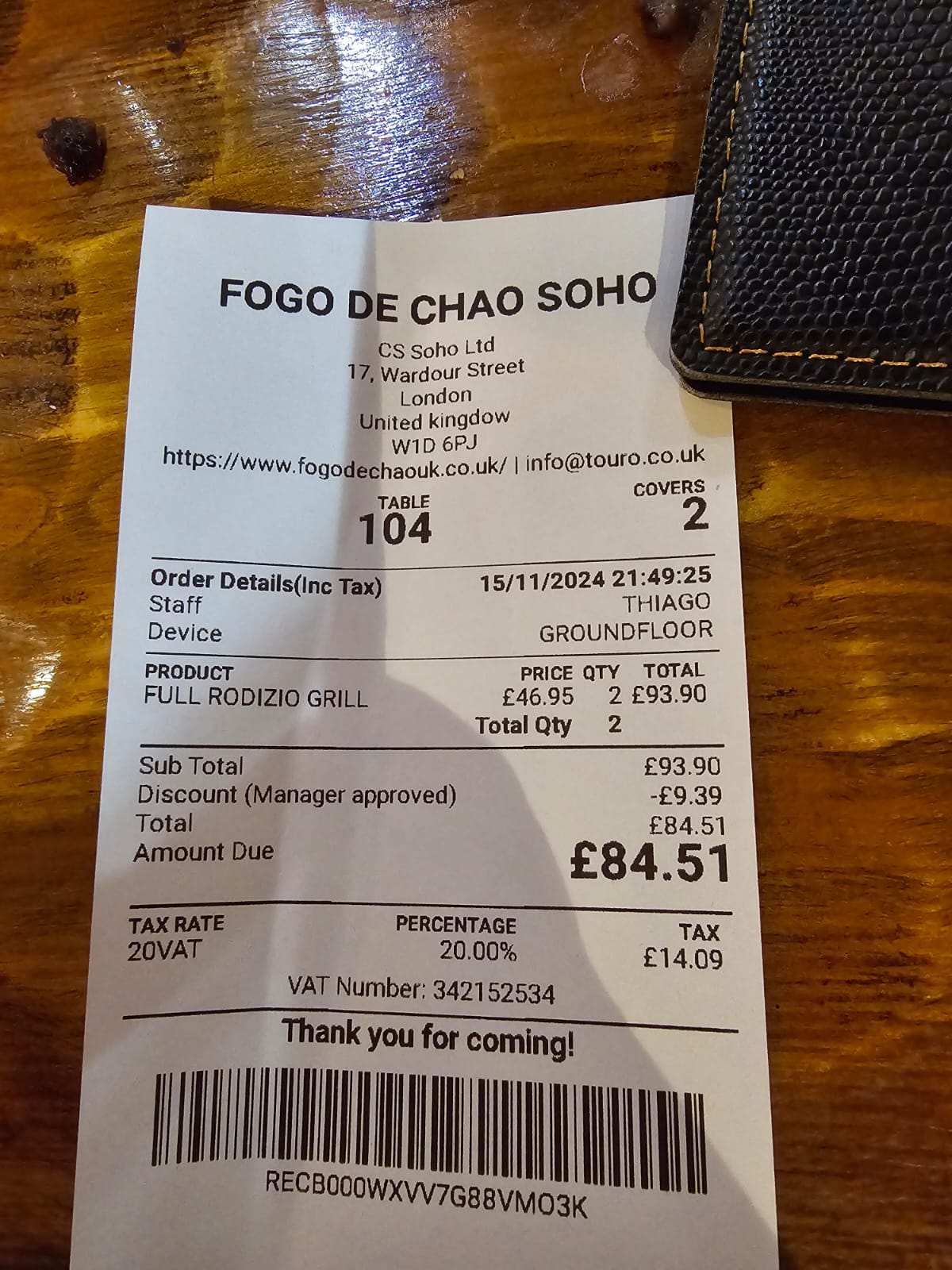Staff: I really feel sorry for them. It must be difficult and stressful to work at a restaurant like this. I often see them bump into each other. They input my drink incorrectly which led to another waitress ordered wrongly for my second drink. Some of the waiters don’t know how to cut and serve properly in Rodizio style. They also lack awareness of the amount of food been offered to the tables closest to them and left those a bit further away in the cold as they have to return often to the kitchen after cuts but then returned to the same tables and leaving those farthest frustrating by waiting and only get the less favourite food passing through to them instead. At the end I had to ask a waitress that I had been waiting the whole evening for Picanha only to see they have been repeatedly offered to the other tables but not our end as we sat at the farthest. I requested the next serving to be brought to our end to which they obliged.