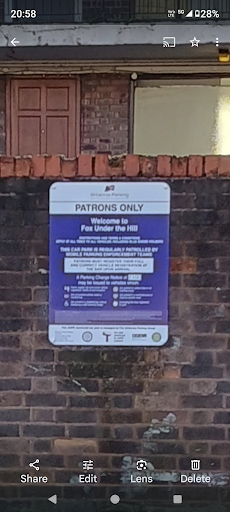 Read moreCorporate chain hospitality at its worst. All the charm of a building society in Grimsby. Called in with a mate for hot drink drink and a meal. Ordered drinks/meal at the bar. Eventually got rather poor tea and coffee. Then waited in a dreary space. And waited... Noticed that other people were waiting ages for their food. Bar staff seemed to be mainly interested in doing some sort of strange ballet, lots of towel flicking and strange hip movements, but very little service. Seemed more interested in themselves than their customers. It wasn't great entertainment! After 40 minutes, asked at bar and told that they'd "lost the order". Got refund and left. Few days later got £100 parking fine (I'm not the only one caught like this - see Google reviews). Notices clearly say that it's a car park for patrons, but in MUCH smaller letters tell you to register at bar or be fined. See untouched photo. But they do have other large signs to tell you they accept no responsibility for anything happening to your car. . "Oh, the parking's nothing to do with us, it's the contractors!" Bar staff, of course, do not mention anything about parking when you order. I can't believe anyone would ever revisit the Fox Under the Hill. A perfect example of why pubs...