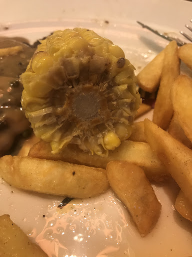 I asked if they would put an alternative on mine in place of the missing veg and I was offered a piece of corn on the cob I thought this would take a while to cook but to my surprise it came out Within a couple of minutes. The corn was so over cooked it was soggy through to the middle, it was brown looking. (Photo) Must have been stewing for a long time. The sirloin was fatty with some hard gristle