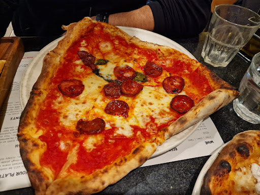 The food was as expected, however upon entering the premises, we were not greeted and therefore left standing waiting for the host, even though it was not busy. The host then acknowledged us after a few minutes and had given us a hand gesture. While thinking we were allowed to take a seat, we chose the seat nearest to us which was prepped with a menu. However, once the hostess saw us, we were reprimanded that we were not allowed to seat and that her hand gesture she made was meant to stand and wait, we suggested to get up but was then brushed off by the hostess. After ordering, both waitress and the hostess treated us with a disrespectful glare whenever they had walked pass our table. Moreover, because we had coffee and treats from the cafe before, we were then asked to not eat inside the restaurant which was understandable, however, the delivery by the waitress so rude and impolite. As the whole encounter was unpleasant and uncomfortable, we had decided to leave and get our pizzas to go. Because we had visited this restaurant after hearing about the £5 pizza deal, when asked for payment, we had then asked the waiter about the deal, she had quickly dismiss us and and asked for the qr code, we were then left baffled because we were not offered any help, and so we spent 10 minutes or so, trying to get the deal. Because the app was not well made, we were having issues with the app, which was not helpful as we were not given any help but instead the waitress was rude and condescending, therefore we decided to pay full price...