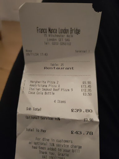 That tried to herd everyone on the left small space , appreciate quieter and easy to clear , but felt robotic . People not engaged with on entry , no greet , how are you . It was about keeping people to tables to clear at end of day quick No add ons with food ,salad and coffee ,desserts ,? Talk guy who grunted tables lyo me was that one there that one or that one ? Ok I will sit there then. Other people came in ( a family 2 adults 3small little ones ) because been herded to 1 small area they were clearing lots up from previous table (not busy ) while they waited and plenty of tables free.,no engagement with children at all ? No colouring to give mum and dad a break ?need kids packs Franco ...... One manager rolling stones tee shirt ? Is that uniform didn't look managerial ? phone in back pocket apart from.chatting to the team was reluctant to engage with any customers .she preferred her conversation with them And it was basic with customers ? Pizzas left on side without picking up and out , and at one point a delivery was slid in a box from plate from tall guy ? Not great , chucked in with no care. I would have been furious . One couple didn't want to be herded into the corner and because they were away ,she waved for attention a few times .in the end I had to ask female manager is the lady to get someone to serve them? Tall guy not far away too busy doing nothing for some time and walked past once . One lady leaving shift , hugs kisses with all team ,and loads of loud banter with kitchen shift ,took good 5 minutes to leave , couple next to me said shame not same focus on us waiting for food ?AGREED Alex did his best . I asked him how he would rate service and he said 8/9 , great team spirit . I said I rated 5 because if that team spirit seen coversations between team and the long goodbyes was given to customers it would be 9. I eat in Bromley / kings cross and Victoria and this service is the worst .no regard for the people in front of them , poor engagement and lack of care . Give the customers some attention and not the team member...