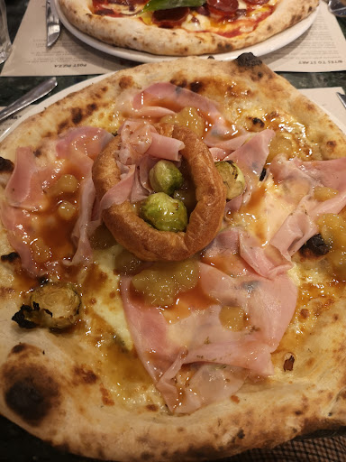 Ā Ā Ā Read moreLovely and affordable! I was on the hunt for a Christmas Pizza, and this was nice but not quite right - the Yorkshire pudding and its contents were so cold, as if it'd just come out of the fridge, and all the meat on the pizza was cold which is probably normal for porchetta, but I think it would have been nicer if it was hot and crispy, more roast dinner-y. Plus, a cheese base is a ticking time bomb against solidifying, so by the time I got halfway through the pizza the cheese was cool and solidifying, and the meat and apple sauce were cold already so the whole thing was a bit sad and cold. I love cabbage so I thought I'd like the sprouts, but they had a very strong plastic-y taste. It reminded me of wasabi so maybe it's horseradish but it was overpowering and I could taste it long after I'd finished. Overall the pizza itself was a bit sad and disappointing, and not that Christmassy. They also definitely skimped on the gravy, compared to the photos, which would have added to the Christmas feel. The fonduta was AMAZING, I strongly recommend it but my partner's bruschetta was disappointing as the tomato sauce (delicious though it was) meant the bread itself was soft and soggy, which is disappointing when you expect bruschetta to be crispy at the edges. It might be better to serve the sauce in a separate dish so it doesn't soften the bread. The prosecco that came with the Christmas menu was really tasty and very smooth, and the whole atmosphere of the restaurant was lovely, we'll definitely come back! Just a bit odd how hard it is to find the toilets, as there are no obvious signs to tell you that they are downstairs, and it's a pain that there is only one...