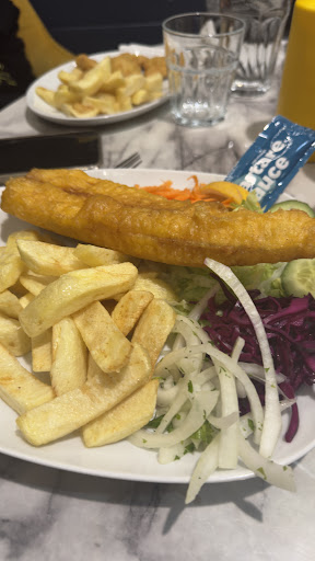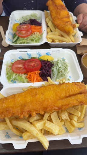 Now, let's talk about the food! The fish was perfectly cooked, with a light and crispy batter that had just the right amount of seasoning. It was flaky and tender on the inside, absolutely delicious! The chips were golden and crispy, seasoned to perfection, and complemented the fish wonderfully. I also appreciated the generous portion sizes, making it great value for money.