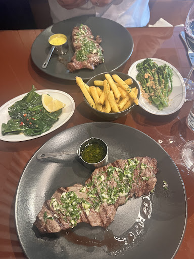 The ambience of the restaurant is warm, sophisticated, and intimate with soft lighting, plush booths, and a chic bar area that makes it ideal for date night or a classy dinner with friends.