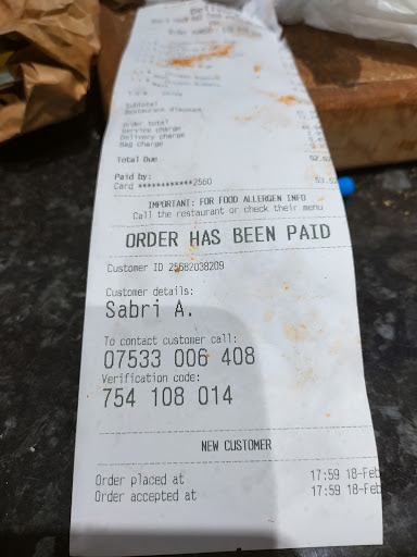 I might expect disruptions at the weekend but this was a Tuesday night. And I appreciate that the restaurant does not have full control over JustEat's behaviour, but 50+ minutes of takeaway food preparation is unacceptable. After this humiliating and frustrating experience, being deceived both by the restaurant and the driver and facing a brick wall of customer service, I have uninstalled the app and will not be ordering again here...