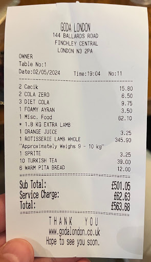 Read more7 of us went for the whole lamb experience. The lamb was honestly very nice however to many other issues here. They are charging top money for this experience and it was not good. The shop is almost a cafe concept inside hardly anything wow. We ordered starters ÂŁ7 for dips⌠beetroot and feta tiny tiny portion ÂŁ7,90 awful. A friend ordered some jacket potatoes done on the charcoal, nice, ÂŁ23 for 3 potatoes. The lamb was a fixed price, on the bill an extra ÂŁ120 for the extra 3kg on the whole lamb. That is open to all sorts of suspicions when did we weigh it. When did they tell us how much it weighed. We had 5 Efes beers we ordered a few more and they were hotter than room temperature. NO MORE cold EFES beers at 8pm, if your going to charge too dollar then the service needs to be faultless. At the end 7 of s 834ÂŁ not even a drink on the house. I even said to the waiter we paid 834 any chance of a drink on the house. Yes my friendâŚâŚ. We are still waiting. Be warned donât go for the whole lamb less then 10 handed or itâs far too expensive. Itâs in the middle of Finchley and unless matey boy sorts out the extortionate prices the novelty will wear off. Locals wonât come back and last time I looked Finchley wasnât a tourist hotspot. Average at best....