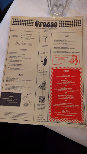 Read moreWow! I'd had Grasso on my list to visit since it popped up on my instagram feed and it was definitely worth the wait. I love traditional Italian food so wasn't sure what to expect from an American twist on the cuisine but Grasso does it so well. All of the dishes were delicious and flavoursome. Plus the portions are huge! There was plenty for us to share and try each others choices. For starter we had a selection of mozzarella sticks and burrata. I will normally not order burrata outside of Italy as so hard to get a good one but this was perfect. The Italians would be outraged but we ordered some garlic bread to mop up the rest of the burrata once we'd finished. It was served with tomatoes which were beautifully sweet. The mozzarella sticks were definitely American style with a long cheese pull and just the right amount of spice in the 'nduja sauce which was offset with the honey. Main course choices were chicken parm, penne alla vodka and mom's spaghetti. The chicken parm was the largest piece of chicken I had ever seen and cooked perfectly. The penne alla vodka was the perfect balance between the rich tomato sauce with a hint of vodka and chilli. But, the star of the show was Grasso's famous mom's spaghetti with meatballs. It was a traditional American take on a classic and done so well. Only a couple of us had room for dessert and opted for tiramisu. The slice looked huge when it came out but it was so light so the plate was finished! Grasso has a small menu which I usually think means everything on it will be done well and it certainly was in this case. It's hard to know what to choose, which is a great reason to go as a group so you can try each others! As well as the amazing food, every member of staff is attentive and friendly. The decor in the restaurant is relaxing, as is the music. However, when you go downstairs to the bathrooms, it's party time! Disco lights and even a DJ! I can't wait to visit again. The only thing that would have improved the experience would have been if they sold the crockery as I'd have loved one of their...