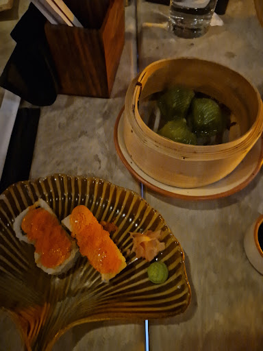 The food was appauling really. The sushi was good, duck bao buns were mid with funky textures, prawn dumplings were good. Mains (thai green curry) was inedible (7 out of 8 of us had it). It was so salty that I had to ask the waiter to bring another, which was also too salty but didn't bother complaining as I didn't want to cause much fuss. For the dessert, vegan cheesecake was actually really good and choc cake was mid , you can tell it was pre packaged and not made on site.
