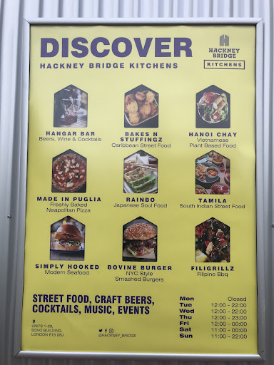 Hackney bridge is a market style food venue, hosting a number of vendors offering varied quisines.