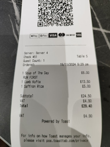 Read moreOverall, my score would be 4.5 out of 5. I came to dine in here on Friday night. It was quiet, not busy at that time. It is not that big a restaurant, but the decoration was beautiful, and Andrea Bacili's songs were playing there. To start, I ordered some lentil soup. It was hot, how it was supposed to be, and it was delicious. For the main course, I ordered minced lamb kofta. It came just before I finished my soup. There were 2 skewers of kofta weighing around 200-250 grams. It was cooked medium well, and it was a little drier than I expected.On the garnish, there was some rocket salad and grilled bell pepper. I was very hungry and ordered a portion of saffron rice. By the way, both the starter and main course were served with freshly baked hot puff bread. Few suggestions to improve: first, on the menu they need to indicate how much a portion of food weighs. Then customers would know how much food they need to order. Second, as feedbacks before me mention, they need to clarify VAT on the bill. They charged an extra 20%. So, how much of it is for service charge? Does the menu exclude VAT? They all need to be clarified. Moreover, there were bread crumbs under my table. In conclusion, food is good, service is good, and few things need to be...