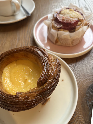 Read moreThe cafĂ© had a calm and quiet atmosphere, mostly visited by elder people. The natural lighting was lovely, which made the space feel nice and welcoming. It was also quite spacious, and the outdoor seating area in front of the cafĂ© was decorated with flowers â really pleasant to look at. The staff were friendly and kind, which added to the good experience. The flat white was a bit bland in flavor. The plum cake had a homemade texture and wasnât overly sweet, which I appreciated. I do wish it had a bit more plum, especially considering the price â that part was a little disappointing. The crĂšme brĂ»lĂ©e croissant had an excellent pastry â perfectly flaky and buttery with no complaints there. However, the filling tasted more like flan than crĂšme brĂ»lĂ©e, which was slightly underwhelming, though I still liked that it wasnât too sweet. One thing Iâd really like to suggest is keeping the serving trays cleaner. It would definitely enhance the overall experience if the trays...
