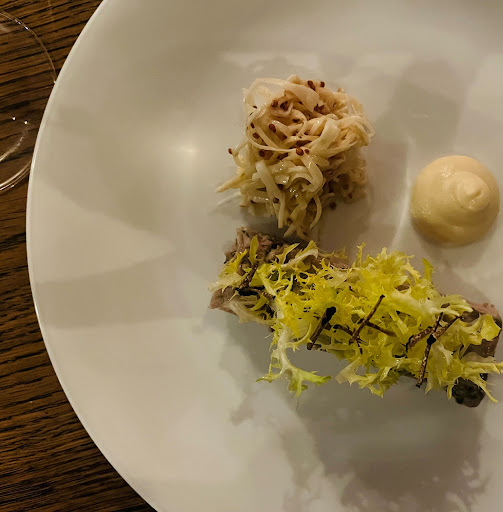 We had the mackerel starter which was outstanding, I had the brill, kohlrabi and mussels, which was delicious, the fish cooked beautifully, however, it was cold by the time it was served to me, ditto the chicken, it was delicious but lukewarm. The lemon tart for dessert was amazing.