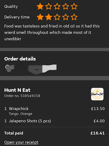 Ordered through one of the food ordering apps (not mentioning the name in case this review gets chalked off for third party company disclosure rules but let's say it's the one with the orange background for it's logo and the annoying catch phrase "Did somebody say..."), in any case the food was quite literally inedible and utterly bin worthy the whole lot. The entire order tasted like it was at least a couple days old left overs, with every piece of chicken from the chicken fillet in the burger, the chicken strips in the wrap to the chicken wings and the jalapeño cream cheese shots all literally reeking of this wierd old refried oil mixed with a musky under armpit bii-oh smell. To top it all off the whole thing was devoid of any flavour with little to zero salt and the only prevailing taste was the stomach churning greasy old oil. I'm not sure how this place has managed to pull off a miracle with such high reviews but it is shockingly bad and I would urge anyone and everyone to avoid this place like the plague or feel free to...