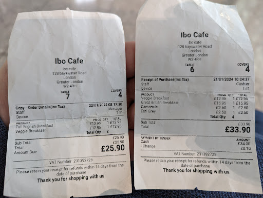 Read moreI recently had breakfast at Ibo Cafe and was disappointed with my experience. While the cafe has a charming and authentic atmosphere, the breakfast was overpriced at £12.80 for a very basic and skimpy meal. Most full English breakfasts in London are served for a lower price and include more items. Although the breakfast was cooked well and tasted good, the service was a big letdown. I had to wait at least 15 minutes before receiving my breakfast, and the coffee was not served immediately despite requesting it three times. I received my cappuccino five minutes after finishing my breakfast. The cafe was not excessively busy, so there was no excuse for the poor service. I recommend that the quality of service be improved, and the content of the breakfast be improved or the prices reduced. Given the poor service and overpriced breakfast, I would rate my experience as only...
