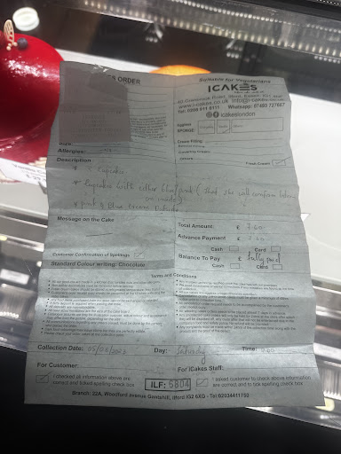 Read moreI placed a custom order for my brother’s 18th birthday party at the Gantshill branch. The staff took her time and paid attention to the little details I wanted which I appreciate. However, the results did not match my expectations at all. I looked at their Instagram and saw that their work was neat but my order was not made to the same standard. The cake didn’t look neat and even started sloping to one side after a few hours. The main issue was the colouring used for icing. It was so strong that it was staining the surroundings and people’s teeth. My brother had to go and brush his teeth because the staining was so bad. I called the shop to let them know about the colouring issue and they said I should have been warned about this when placing my order, which I was not. I have ordered dark colour cakes before from previous places but did not end up with such a mess. I’m truly disappointed that I paid £90...