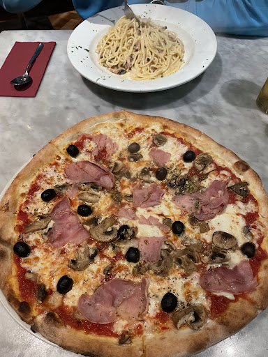 The food is very good here and the portions are big. But sadly it is not enough for customers to leave this restaurant happy. Staff is rude and that made the experience just not what You expect when You come into a restaurant. The main waiter (older guy) is spinning around like a bee and looks crazy stressed although has just a few tables. When we came in he immediately told us to wait outside and did not let us come in because some other ladies were waiting as well. Now I understand that they were there first, but the waiter could have said “hello, please wait a moment” or something like that. Then when we came in we didn’t really understand were to sit because he ran away again. When we got to the table he brought the menu and left. After, we ordered drinks and food. I ordered coke for myself and I saw when other waiter took already opened 0,5 l coke bottle and poured it in a glass for me. When the waiter brought pasta to my boyfriend he was sprinkling parmesan cheese not even looking at us or the plate. We joked that it’s good he didn’t sprinkled the cheese on my boyfriends head. As I said food was delicious. But when eating I was observing everything that was happening in the restaurant. Since I am a waitress myself at a fine dining restaurant and I study hospitality management it’s always interesting for me to watch how other restaurants are working. Younger waiter by the bar was drinking water. The older one was always running around like crazy, chewing gum. He even knocked up a sign when opening the door for guests. When we were eating he didn’t check if we are happy with the food or if we need something else. Both of the waiters were never smiling or being friendly and kind. But they were always yelling and talking very loudly, even louder than some tables. Also, these guys do not really know how to carry glasses or put cuttlery on the table. They do this without no trays and very loudly almost throwing things on surfaces. I don’t really understood this stressfull service because the restaurant was for sure not busy. The thing I was not happy about is not even that, but the feeling that you are not welcome and no kindness or friendliness from the staff. It’s not hard to smile or say ‘hello’ or ask if we are happy and how’s the food. I met much better waiters and waitresses in mcdonald’s or five guys. Staff and managers of this restaurant need to understand that good food is not enough to have a successfull restaurant that people would want to come back to. I am, for sure, not coming back...