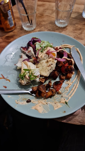 This hipster, cool place hits all the boxes for me: dog-friendly, great-tasting and well-priced food and drinks and music that is not too loud at night you canāt have a conversation. My husband and I stopped here last night and got settled on the comfy couch with our chi. I ordered the green refresher to start (lime, honey and soda water) and he an Aperol Spritz. I got the Chardonnay then and was pleasantly surprised how dry and smooth it was. Our food arrived shortly: my butternut squash and feta flatbread and his sweet peppers and mozzarella on sourdough. I was surprised how my dish was presented as I expected one large piece of flatbread with feta and squash atop. Instead the squash and flatbread are cut into chunks presented on the wooden serving plate with the feta serving as a dipping sauce. Itās an easily shareable portion size so Iām kinda of a piggy in eating nearly all of it. But the squash chunks were roasted perfectly. It was delicious as was the creamy feta. My husband said his dish was good as well but mine was definitely the star. The only downer was the brownie: it looks great and fudgy but is nothing special.
