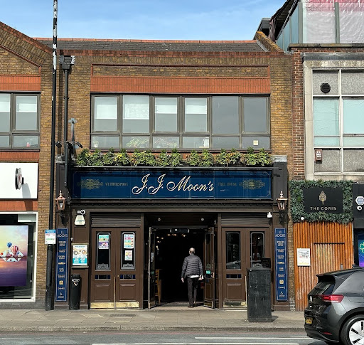 JJ Moonâs is located at a busy junction on Tooting High Street. The nearest Tube is Tooting Broadway which is just across the road.