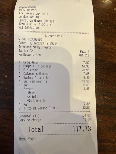 In my honest opinion, I would hesitate to recommend this place to others. If anything, I would suggest considering other options in Belsize Square or Hampstead Village, where you're likely to encounter better value and overall quality. Having spent many years in Spain and being deeply familiar with the culture and its culinary landscape, I feel that this establishment falls short in truly reflecting the essence of Spanish hospitality...