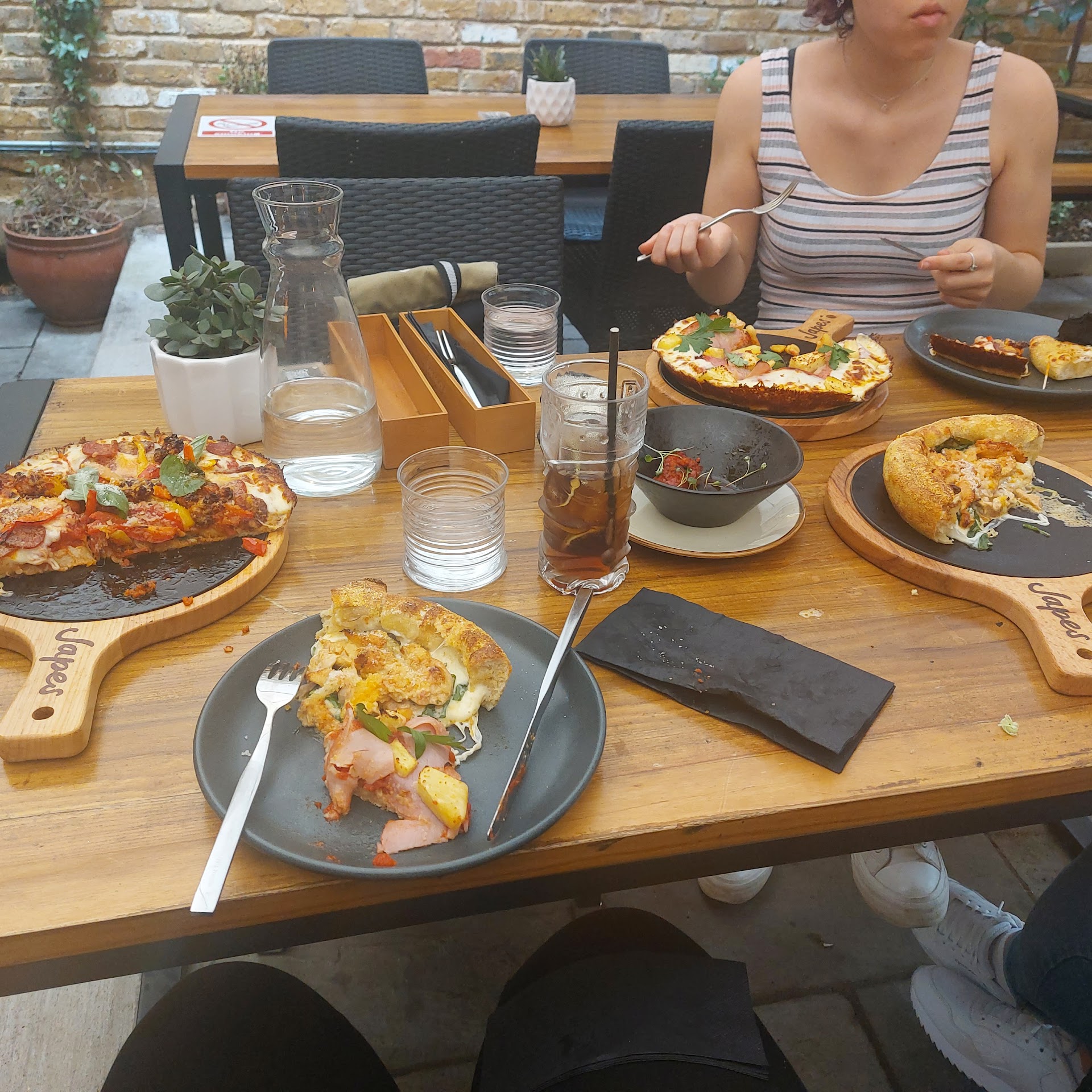 During our first trip to Greenwich in an absolute age (we’re only down the road in Bromley), wandering around the streets and market, we found ourselves peckish and thought be good to try something a bit different. Looking through the window, Japes is deceptively small and a bit lacking in the seating – a swift Google search for the establishment quickly indicated this was not the case, and indeed, being escorted past the kitchen found ourselves in a very pleasant, light and cool part of the restaurant with a large skylight and also a separate courtyard right at the back.