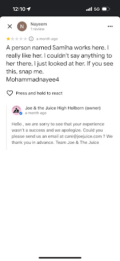 Read moreI usually always go to Joe and the juice in Garrick street, Covent Garden or Dean street. The staff are always nice and friendly even if they’re slow so I don’t mind waiting too much. The staff in Holborn didn’t even bother to acknowledge me. They were rude and weren’t even saying the orders loud enough so that people could hear over the music. They acted so frustrated everytime someone walked through the door. I don’t know what was in my drink but it was not sweet at all. I get the same juice on my way to work 5 days a week so how can it taste so different. I ordered the pick me up and there was no fruity taste at all. Not to mention I found bits as I was drinking. I like to get a juice everyday as a nice treat and justify the price of it as it’s so tasty. I couldn’t even drink half of this. No good customer service to make up...