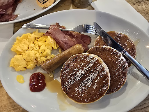 I've been staying in Camberwell for a while now, and I'd often pass this joint and I would muse, how American, I really should check that place out. So I finally stopped procrastinating, and went In with the missus. "I've always wanted to visit this place" I told her as we rocked up to the joint. She looked at me with a sideways glance that said, it's just round the corner, why did you wait till now? There was a bit of a queue, as they were quite busy, what with it being Saturday lunchtime. And after a ten minute wait, we ordered our food at the counter and took our seats. As a lover of pancakes, I ordered the pancake breakfast. And I managed to convince the missus that she should go for the same, but the herbivorous version. After a very brief wait of about five minutes, it turned up. That was quick the missus quipped, Too quick, her eyes narrowed. Well, it seems the reason for the speedy arrival was the fact that the pancakes were premade, and obviously had been sitting in some type of warmer. For they arrived in two states. The top cake of the three was hard on the bottom and around the edges. The middle cake was burnt and hard around the edges and the base cake was a hybrid of both. The missus gave me another look. We tried, but it really wasn't edible, she had a third of her scrambled eggs a rasher of turkey bacon, a bite of that vegan sausage, and gave up. I finished the pig meats served up to me and the middle of the non burnt pancakes, because I'd paid £10 for that "meal" and I was for damn sure going to eat the edible bits, which were just about passable. All through this she keeps giving me the look. "The hot chocolate is very nice she" pipes up, "but It came out of a machine though, pretty hard to mess that up" she says, theres that look again. She snags a passing waitress to inform her of her displeasure. The young lady then informs the "cook" and returns with the offer of a couple free desserts. The missus agrees because chicas love cake, and decides on the red velvet. (Which turned out to be just as below average as the rest of the food) So in conclusion, below par food, (burnt, dry pancakes, flavourless scrambled eggs one sausage instead of the two I saw the table next to us receive, and a bland chewy red velvet cake) but the establishment was very clean, there is that. Maybe because it was a busy period, the food was premade, but that was no excuse when the table next to us gets the exact same dish that was clearly freshly made. Lost a star for that crime, as well as the crime of the worst cup of tea I've had In a long time! Imagine being able to purchase a better pancake breakfast with the same items for half the price from a McDonald's, and it would taste better. Oh, and I had to request syrup, as they forgot to add it to mine. Woeful, worst £24 for breakfast I've paid in a long time. I shall not...