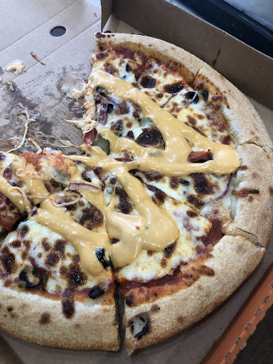 I ordered a cheese burger delight pizza and noted that the gentleman behind the counter started making me the wrong pizza by putting olives on it. So I complained and he corrected his course. To compensate for the wrong order, I was given a free can of coke!