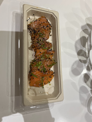The salmon tataki had not been seared, and is so obviously entirely uncooked that I at first assumed I had been sent the salmon sashimi. The slices were so thin that one of them was literally see-through, and the slicing had been absolutely botched; all slices were of uneven thickness and the sides on three were jagged. It arrived covered by sesame seeds and scallion, like the buried evidence of some terrible crime.