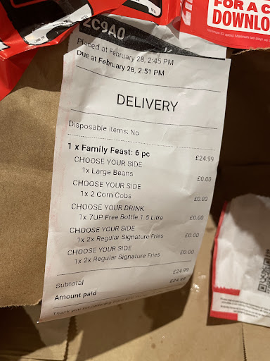 Read moreRude staff with lots of attitude and no manners. We were spoken to so disrespectfully when they had packed an order totally incorrectly. The receipt tells you what should be in the bag so how can you get it so wrong, I can understand mistakes happen but to miss of entire meals, provide a 6 piece bucket when it should of been 10, get all the sides wrong and then tell me i must go through the delivery company when we already waited for the food is not acceptable. We went into store to collect the missing items as when we rang they said they couldn't do anything, we weren't asking for extra food, just what was missing but all they kept saying is they cant do that because it will mess up their system!! Have been going to this branch for over 15 years and its got so bad over time but that comes to an end now, especially as the little girl Laura behind the counter got so rude and wanted to fight my husband!!!! Lots of training needed at this branch as thete is zero...