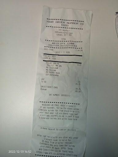 Read moreI gave one star because you can’t give zero stars and post the review! This is the worst kfc I have ever had food from. I can’t believe the size of the chicken pieces! It’s a joke. I ordered 2 x 14 piece buckets and normally this chicken would fill the bucket and the top normally could not close! This time it was half full, the wings and drumsticks must have come off a baby chicken because there was no meat on them. And the rest of the chicken Comes from the back of the chicken which is just bone coated in breadcrumbs! There was not one sauce in the bucket for the chips or chicken so I walked back to the shop even though I paid for delivery, asked where the sauces are and was told we don’t put them in for delivery unless ordered. Well you can’t order them as there is no section on the menu to order them! Then the assistant in the shop is arguing with me about it and didn’t want to give them to me because I had a delivery and didn’t buy it directly in the shop! £55 bill and terrible service! I will never buy chicken from this shop again. I do not recommend anyone to buy food from there if you are hungry or want to feed your family! It is the worst value for money I have ever experienced! Avoid this place like the...