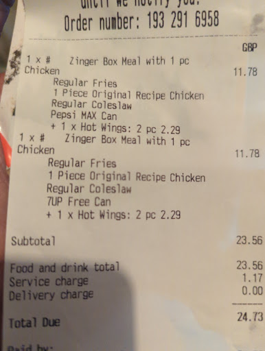 Read moreI use this place often as a takeout the service is normal quite good but they do forget things sometimes which is very annoying after you get home and sat down. Parking can be a nightmare sometimes. Update 22/3/19 last week they forgot to put 2 portions of chips in we only had 3 meals can't be that hard to get right this week had legs of chicken in a meal when I specifically said NO legs about 3 or 4 times I think part of the problem must be they all speak a different language to each other or just can't be bothered. Also the chips are disgusting now they have changed. Updated. Ordered 4 meals and only got 3 portions of chips how hard can it be to count to 4. Update 29 September 2024 Just had a delivery not much has changed forget a portion of chips and should have had a free portion of popcorn chicken. 3 Nov 2024 Just had another delivery and they forgot an 8 piece boneless box we only ordered 2 meals and they forgot to put one in, so can't even count to 2 now, this is an all time low...