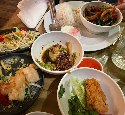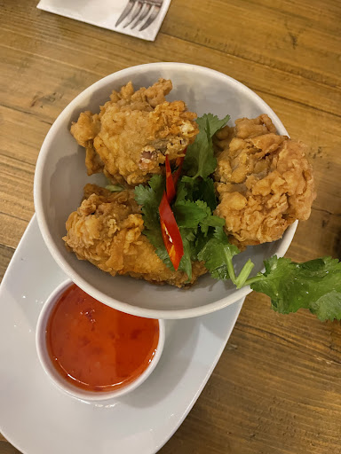 Read moreIt's probably a 3.5.. Large generous portions...however, I'd rather eat more Thai style smaller portions/plates and less expensive so one can order more dishes. As we did not get to try all the menu my comments are only on the food we tried and I wish we had ordered more spicy dishes - as there was no way enough spice! Salt & pepper squid and chicken wontons were really tasty. The Som Tam was weak and not very Som Tam at all in either spice or the balance of the dressing. So if you order it request it to be made "Thai Style". The pad Thai was tasty but this is not a spicy dish anyway. Nasi Gorang .. again isn't really a spicy dish in Indonesia, however, described as one and it wasn't and a bit dry. Then finally the spicy vegan red curry (it says there is a milder option avail) was again lacking in spice. Overall tasty, warming, cosy food, but not very authentic Thai. I will go back again and try the Pad Krapao as that is usually a good benchmark. Really nice wine and service. Table pretty small and overall really loud so difficult to chat. Also, really annoying no menu printed or on a board. I find menus on phones so "covid years" and quite annoying. The last thing people want is to be looking at their phone when out to dinner, it's so unsociable. And it's difficult to choose, scrolling etc. If you are using the green excuse for not printing, then write things up on a board! We would have ordered more food and spent more money had we all been able to look...