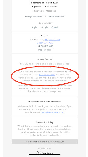 Shockingly terrible customer service! Kol had been high on my list of restaurants to visit, after I saw it on the "50 Best" list. I understand ratings are subjective, but figured it must be something special. I lived in Texas and California before relocating to Europe 10 years ago and have visited Mexico many times and am always on the hunt for great Mexican food. It had not worked on previous trips to book at Kol, but this time, I made it work in our schedule for a 10:15 after theatre table in the Mezcaleria. The website clearly says the kitchen is open until 10:30 and my confirmation (shown below), again restates this. You can also see on their own published menu that there are a few dishes served even after 10:30. We headed straight to Kol from the theatre and actually arrived shortly after 10:00. We were seated promptly in the Mezcaleria, then things quickly went south. We were completely ignored for the first 15-20 minutes we were there. Because we arrived early, we were not too alarmed by this and waited patiently until we were finally acknowledged. The waiter brought us a drinks menu and we had a friendly conversation with the table next to us who had just received a round of food. Drinks took longer than one would expect, but they were brought and still no food menu. We thought, OK, they are in no rush and we will enjoy our drinks. We were then ignored again for 15-20 minutes, as the waiter and other staff seemed to be preoccupied with talking with a friend who had just arrived with a party of four. Finally, after we had finished our drinks and were getting hungry, we had to flag down the waiter and ask for a food menu. It was then that he told us the kitchen was closed and we could not order any food. We pointed out the information on our reservation and on the website, but he said it was not possible. He did comp our drinks, but I didn't go their for a free cocktail, I went there to experience the food at one of the "top" restaurants...