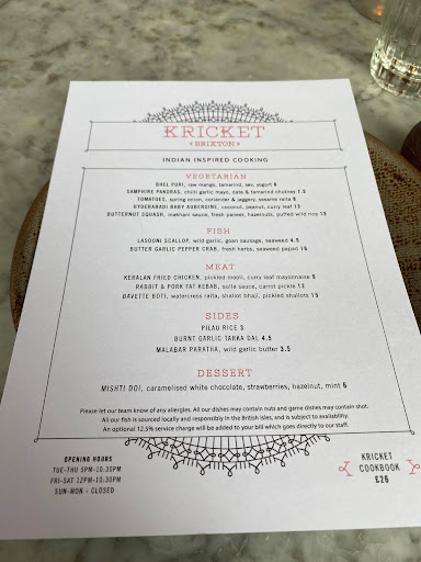 Kricket Brixton is a small venue with a kitchen and long bar. Thus, there are relatively few tables. It could be described as intimate, if you arenât seated right in the window. The staff are attentive and welcoming. There was no music playing, so not a great deal of ambiance or atmosphere for dinner.