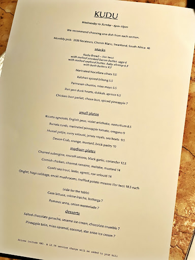 Ā Ā Ā Read moreI had visited the original Kudu as well as Kudu Grill in recent years and both were enjoyable meals (especially Kudu Grill) but as someone living in West London it was quite a trek to get down to Peckham. When I heard about their relocation to Marylebone it was high up on my to do list and I ended visiting around 2 weeks after their opening in September.