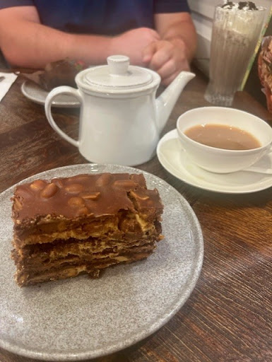 I ordered an English Breakfast tea (loose leaf) and a slice of Snickers cake. The tea was disappointing â no tea leaves in the pot, the pot itself didnât pour well, and the taste was underwhelming. The Snickers cake was a generous slice and tasted nice. I didnât finish it all, but they did give me a takeaway box when I asked.